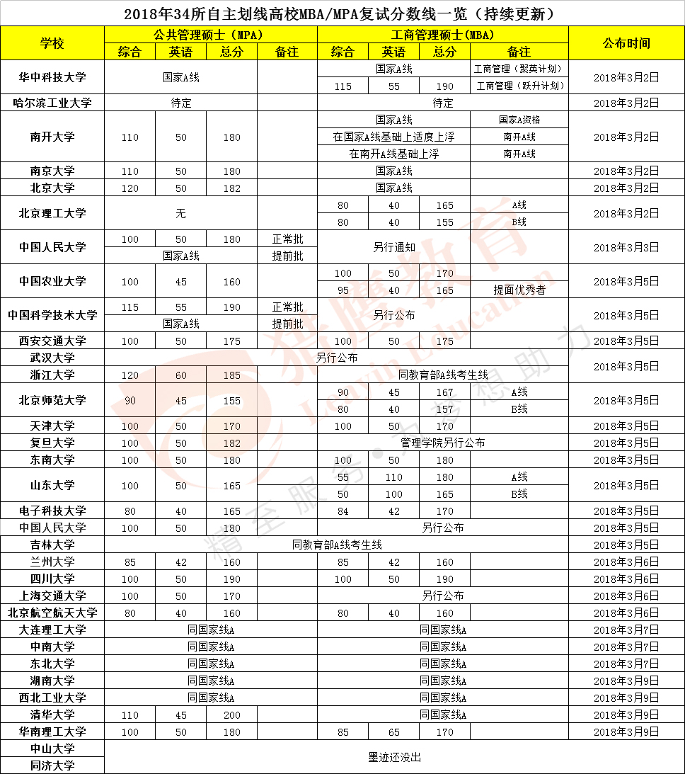 最新2018年MBA/MPA碩士研究生復試分數(shù)線出爐院校動態(tài)